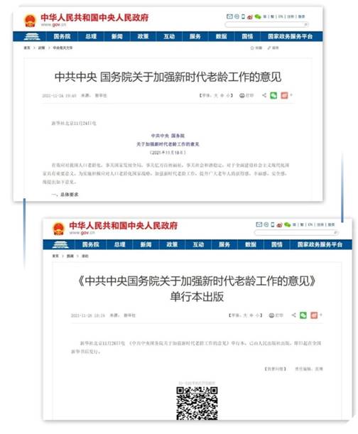 為實施積極應(yīng)對人口老齡化國家戰(zhàn)略,加強新時代老齡工作,提升廣大老年人的獲得感、幸福感、安全感。日前,中共中央、國務(wù)院發(fā)布文件《中共中央國務(wù)院關(guān)于加強新時代老齡工作的意見》(簡稱意見),并已由人民出版社出版單行本。